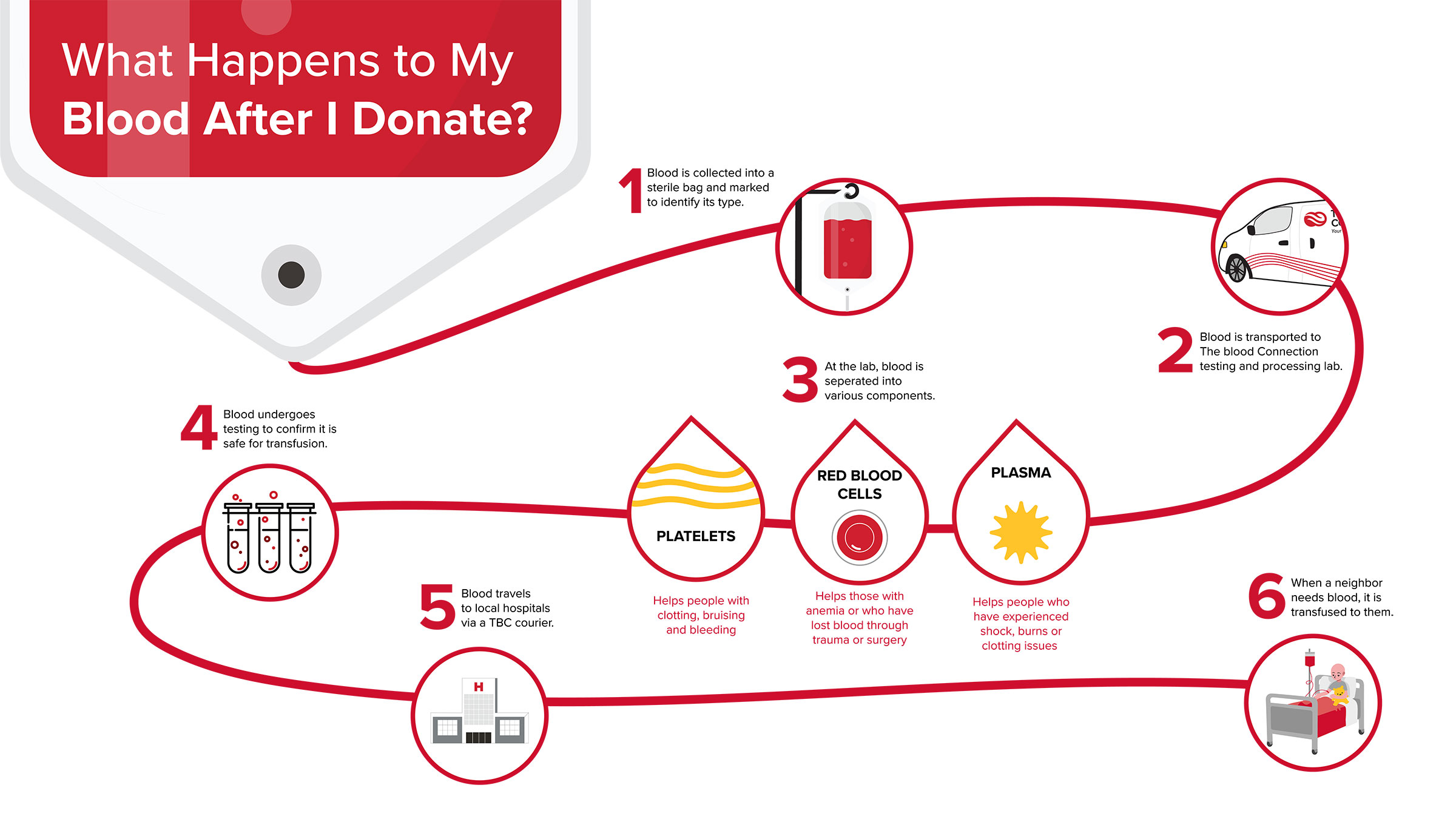 Your blood is going to someone who really needs it, but getting it there takes a team. Our phlebotomists collect the blood, our couriers bring it to our headquarters for processing, our lab techs process it, and our couriers then deliver the products to our hospitals. Once they arrive, lives are saved. And because of our product’s shelf life, that all happens in a matter of hours.