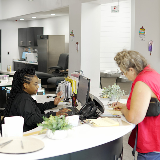 When you arrive, stop by our check-in desk to be greeted by our team. We’ll get you registered with a photo ID, then scan your TBC Express Pass QR code if you’ve already filled out the questionnaire. If not, no worries—our team will guide you through it while you relax.