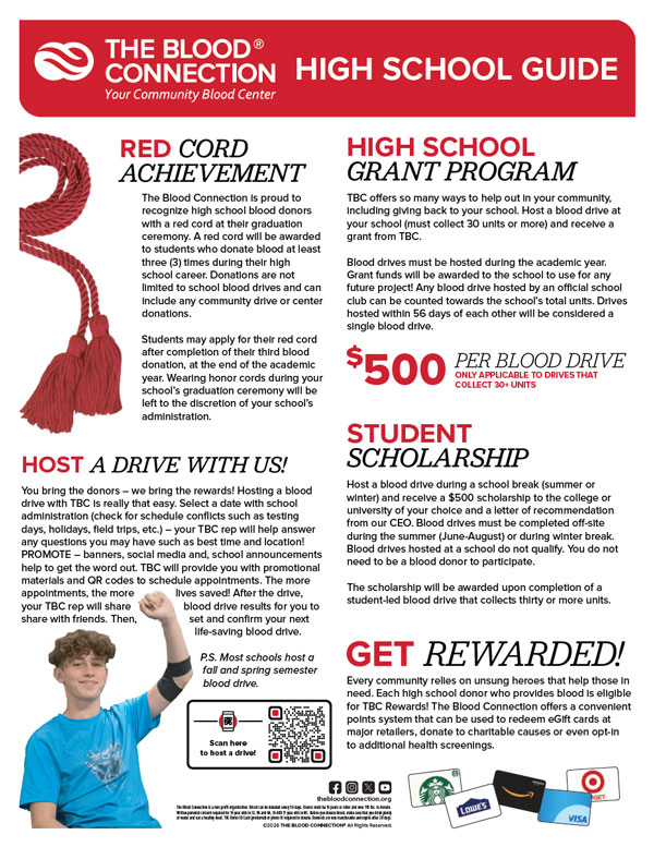 High school students who donate blood three or more times with The Blood Connection will be honored with a red cord to wear at graduation—a visible symbol of their commitment to community service. Request a TBC Red Honor Cord